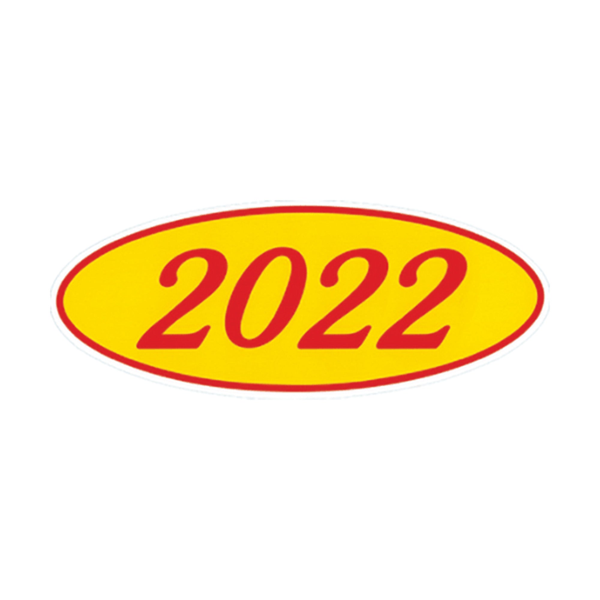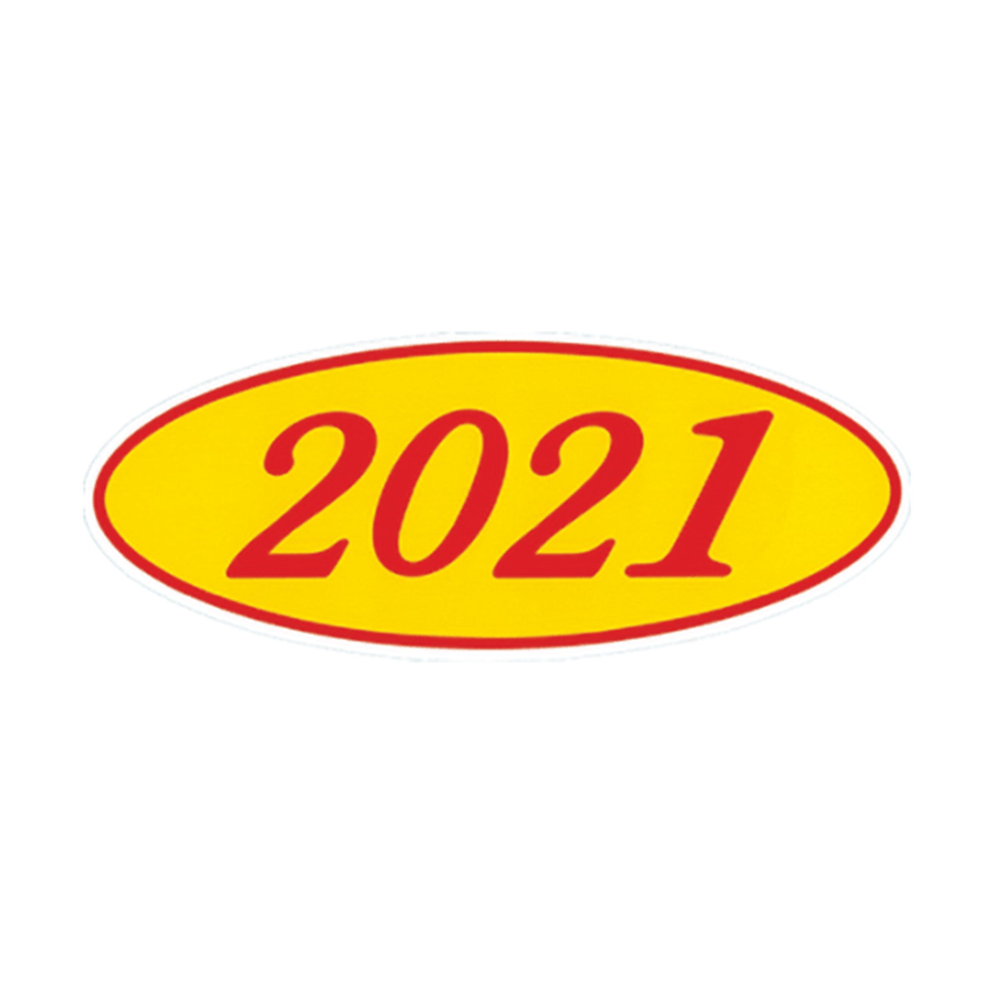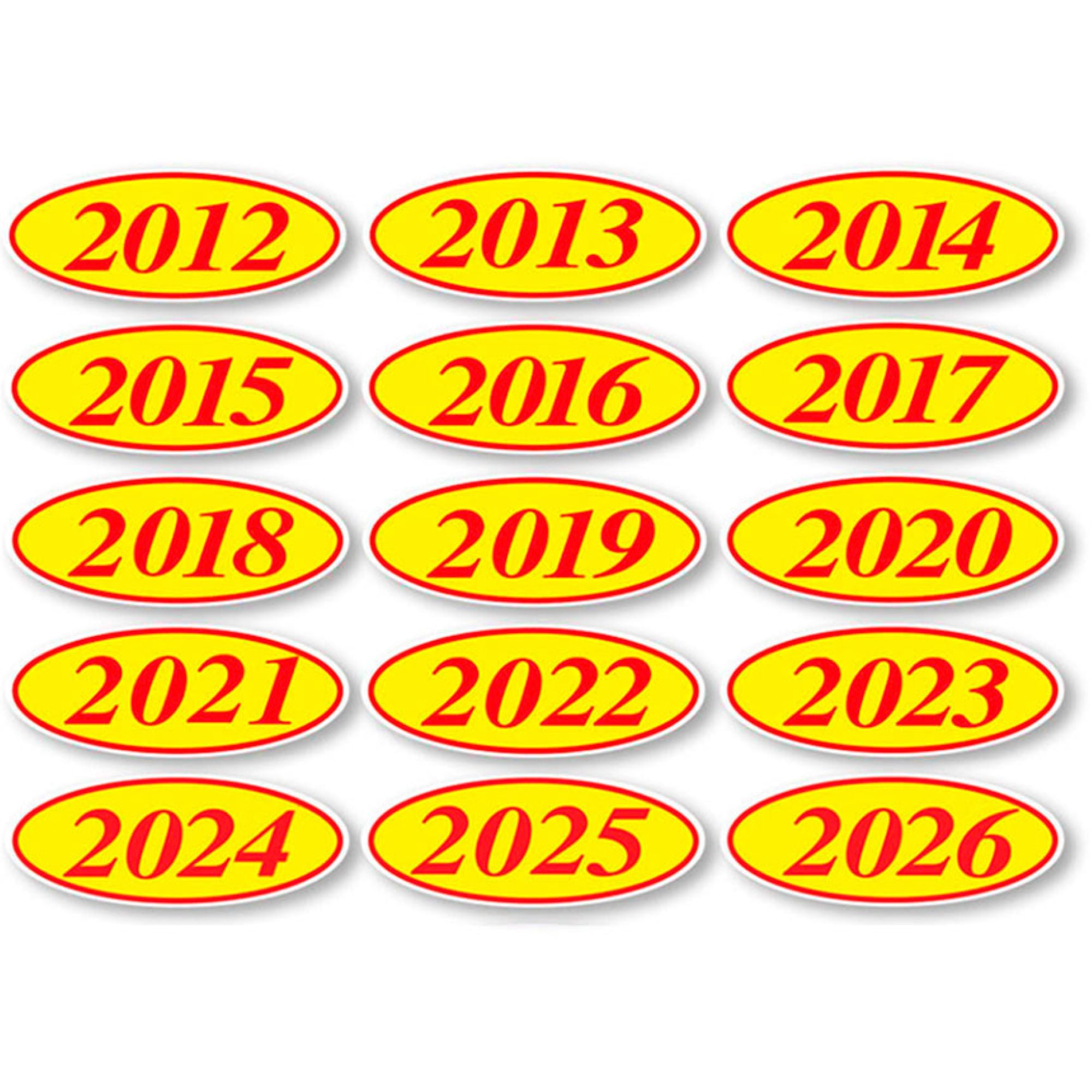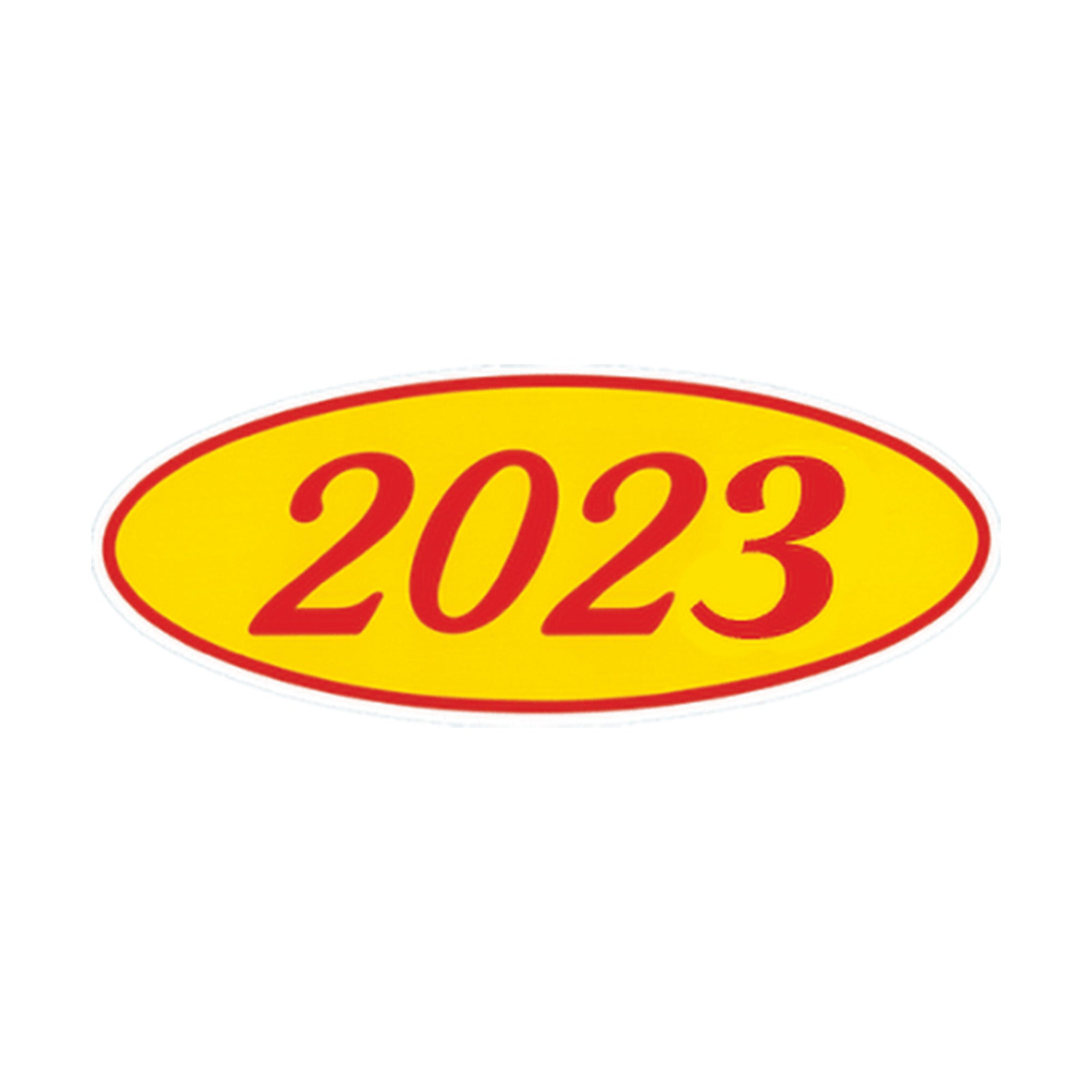 Red & Yellow Oval Year Stickers are made of durable, waterproof vinyl. These non-fade signs demand attention! Each year sticker is slit on the back for easy application. Red & Yellow Oval Year Stickers are neatly shrink-wrapped in packs of a dozen with a cardboard backer to prevent curling during storage. Red & Yellow Oval Year Stickers measure 14"W x 5 1/2"H.